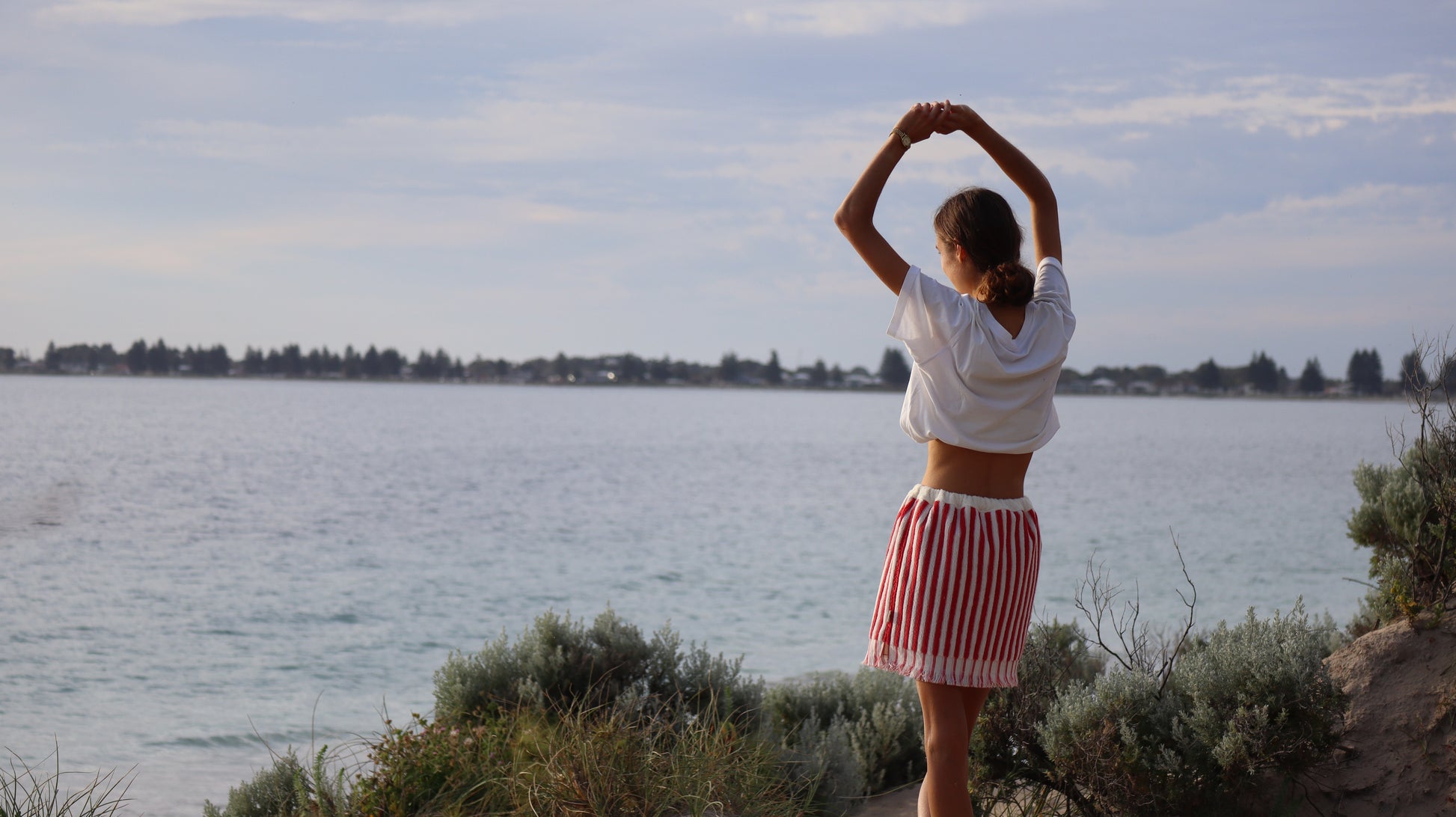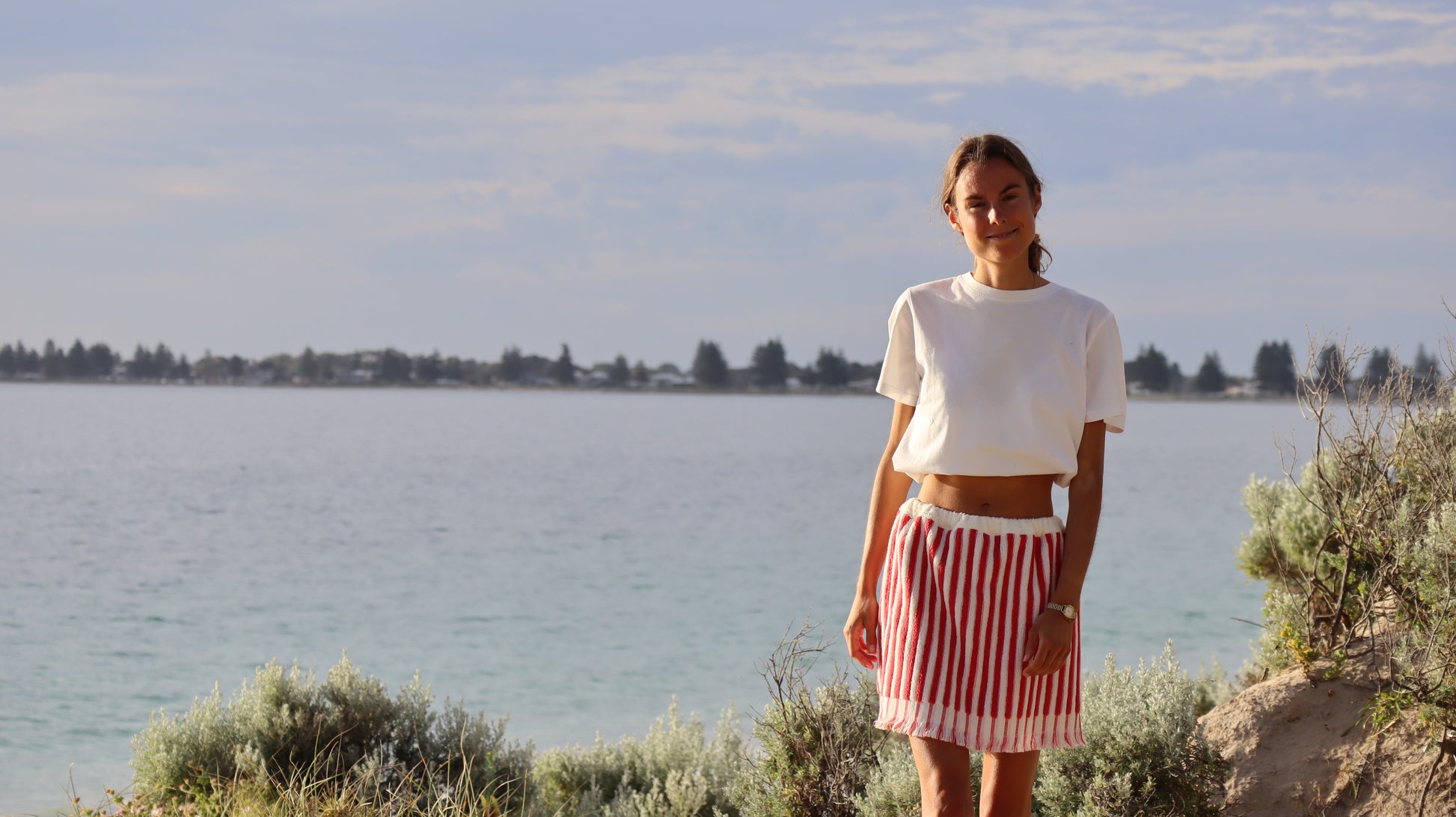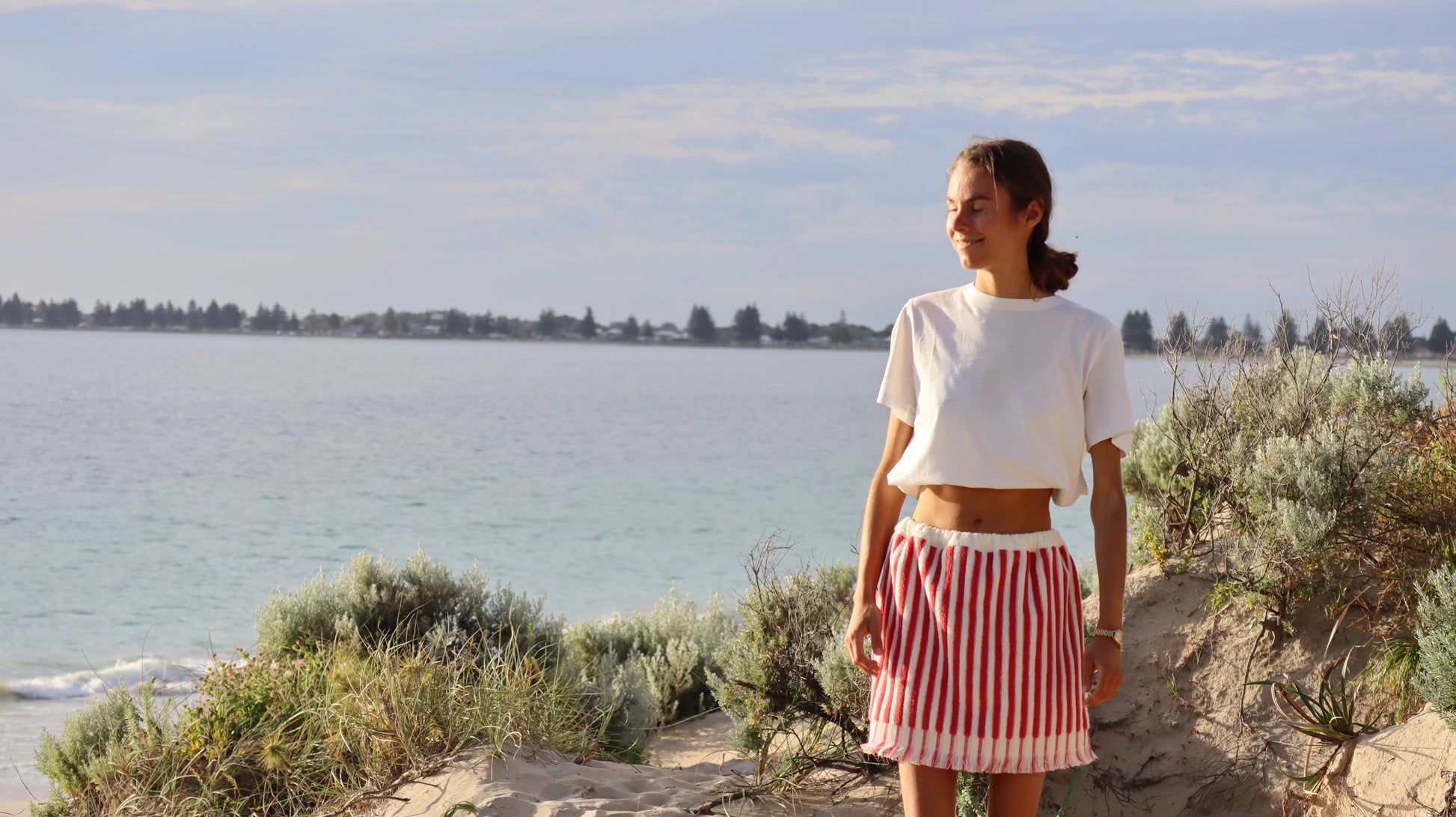 The red mini towel skirt is a one of a kind piece that is both comfy and stylish. Each piece is hand sewn by me in my coastal studio in Western Australia, using thick 400 GSM 100% cotton towelling in a white-and-red colour combo.