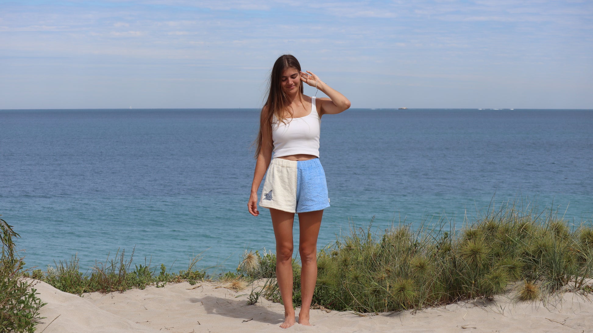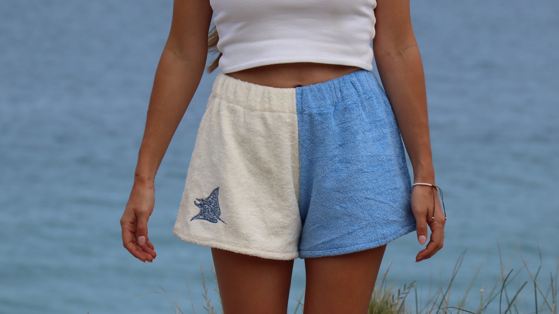 Inspired by the Australian coast, I made these high waisted towel shorts that are comfy and stylish. Each pair is hand sewn by me in my studio in Western Australia, using thick 400 GSM 100% cotton towelling in a soft cream and blue colour combo.