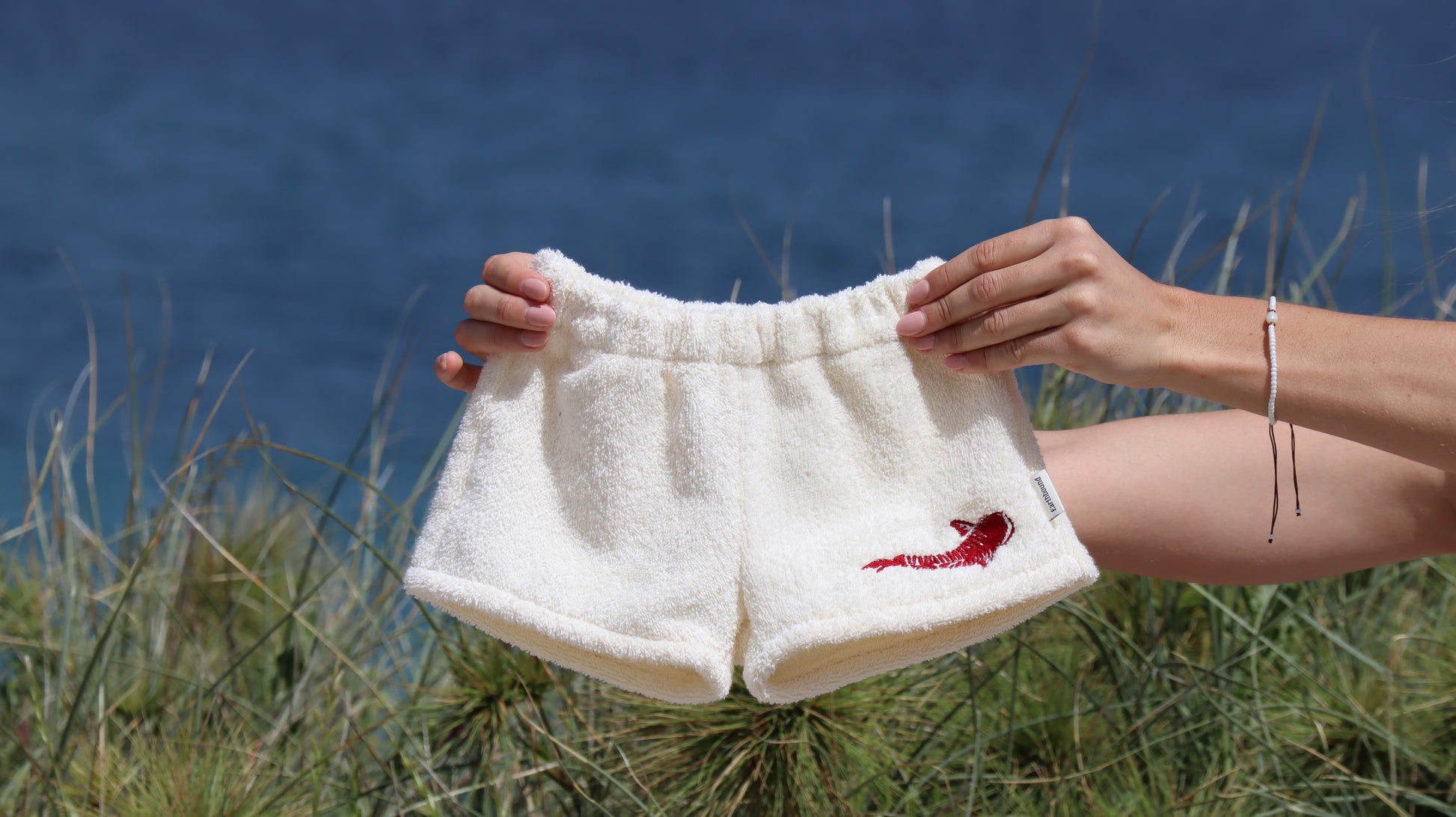 Minimalistic red tiger shark on the front of the shorts.
