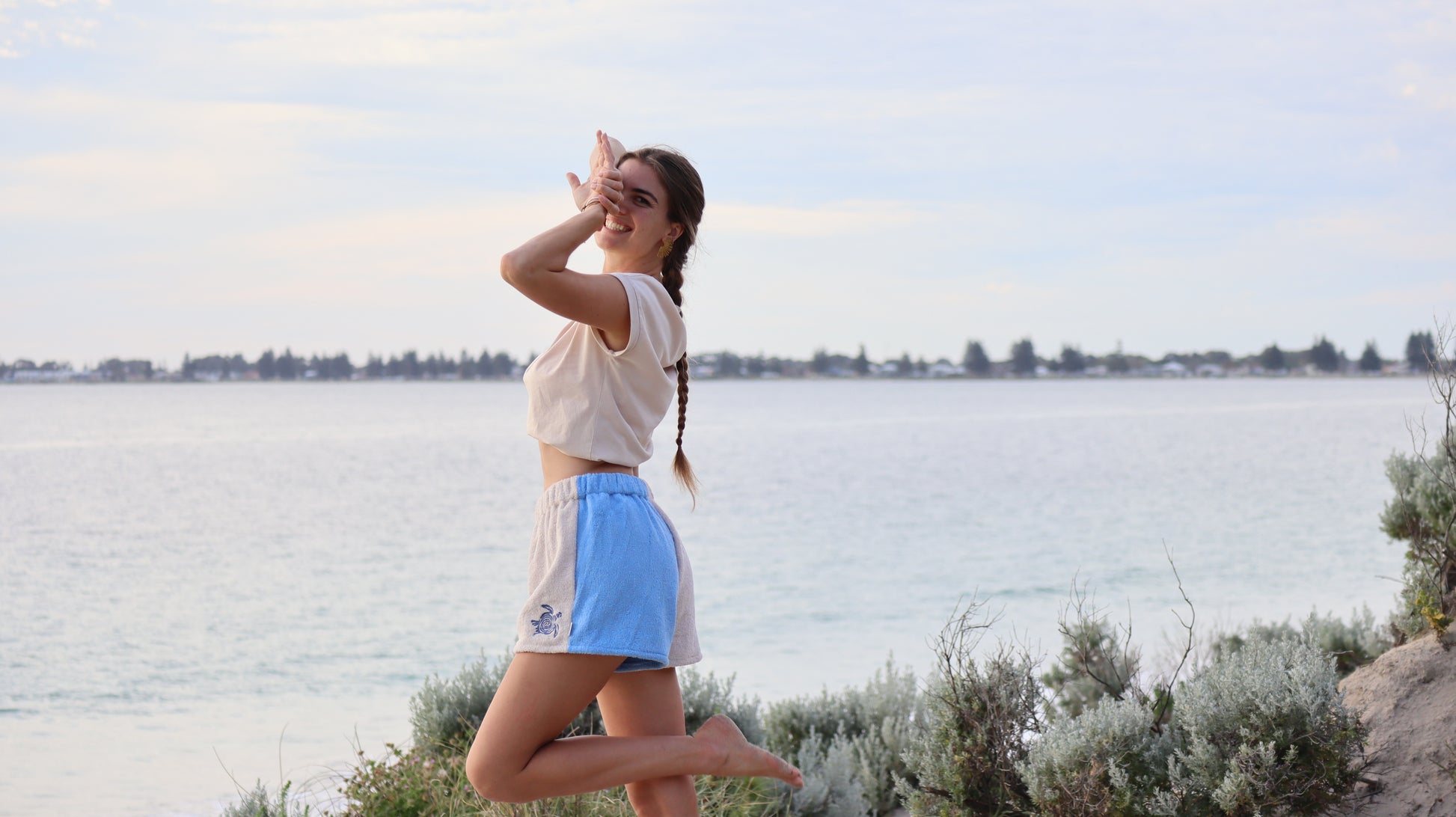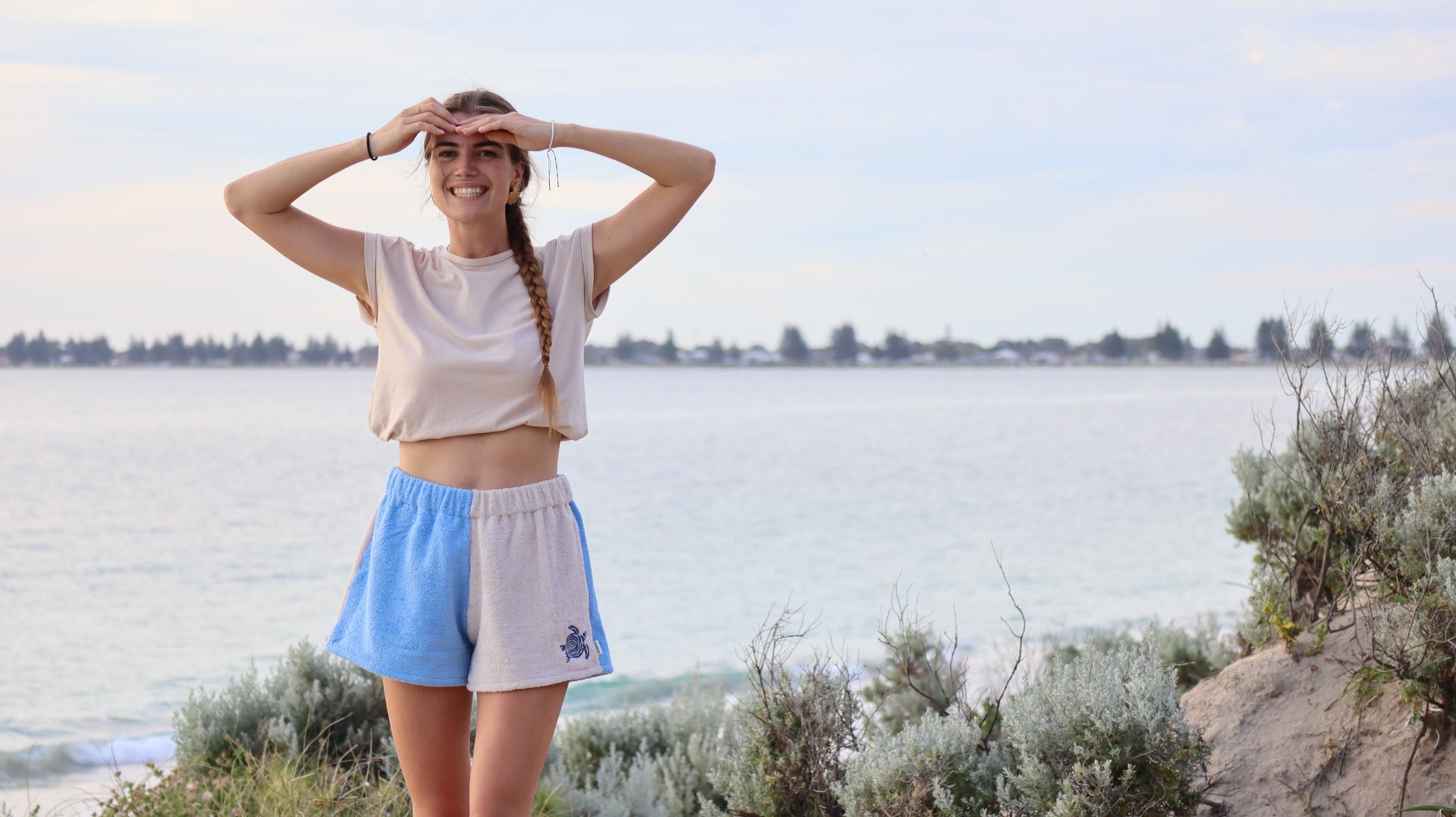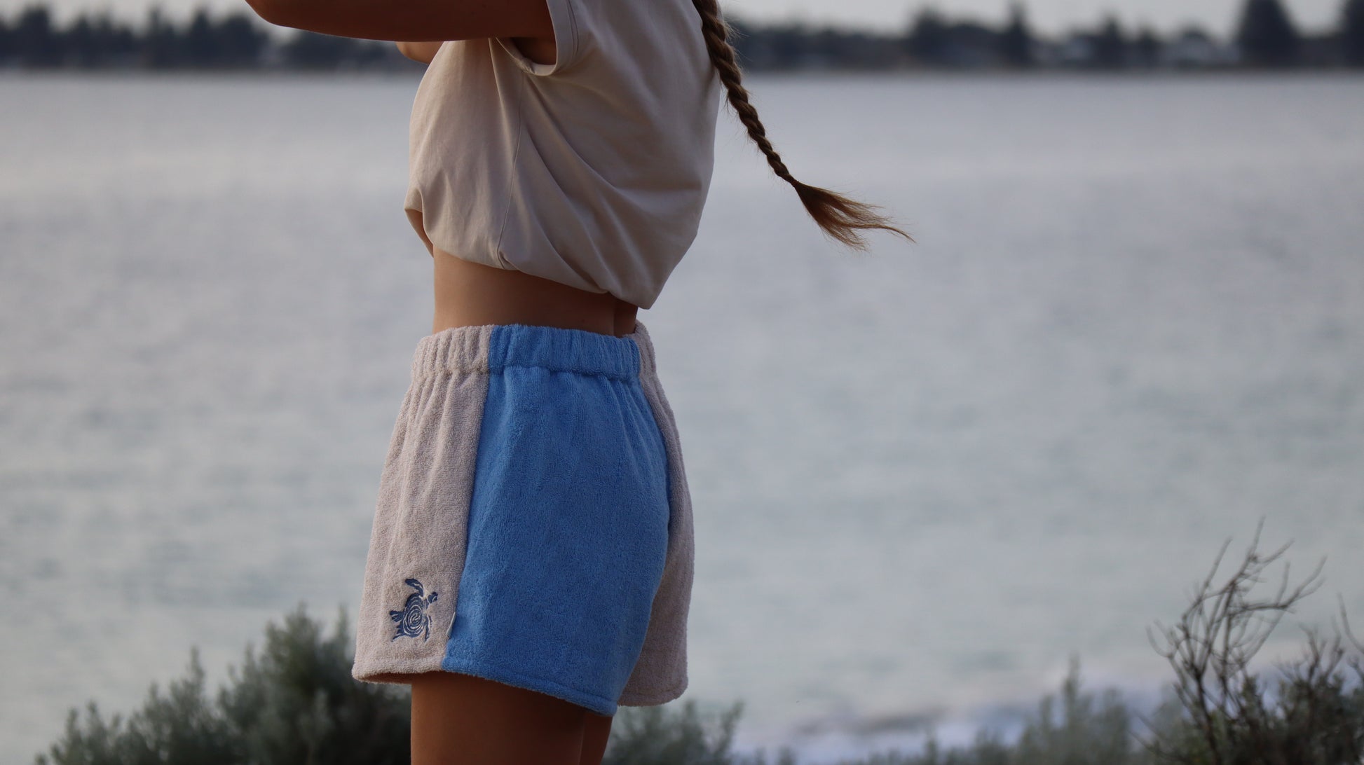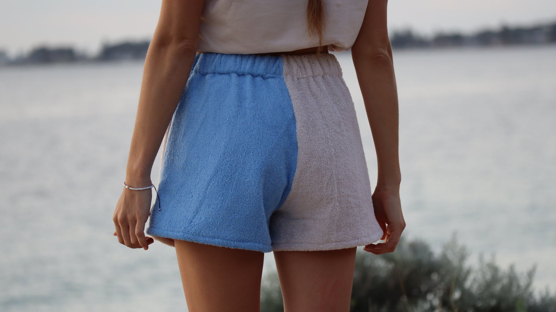 Inspired by the Australian coast, I made these high waisted towel shorts that are comfy and stylish. Each pair is hand sewn by me in my coastal studio in Western Australia, using thick 400 GSM 100% cotton towelling in a soft cream and blue colour combo.