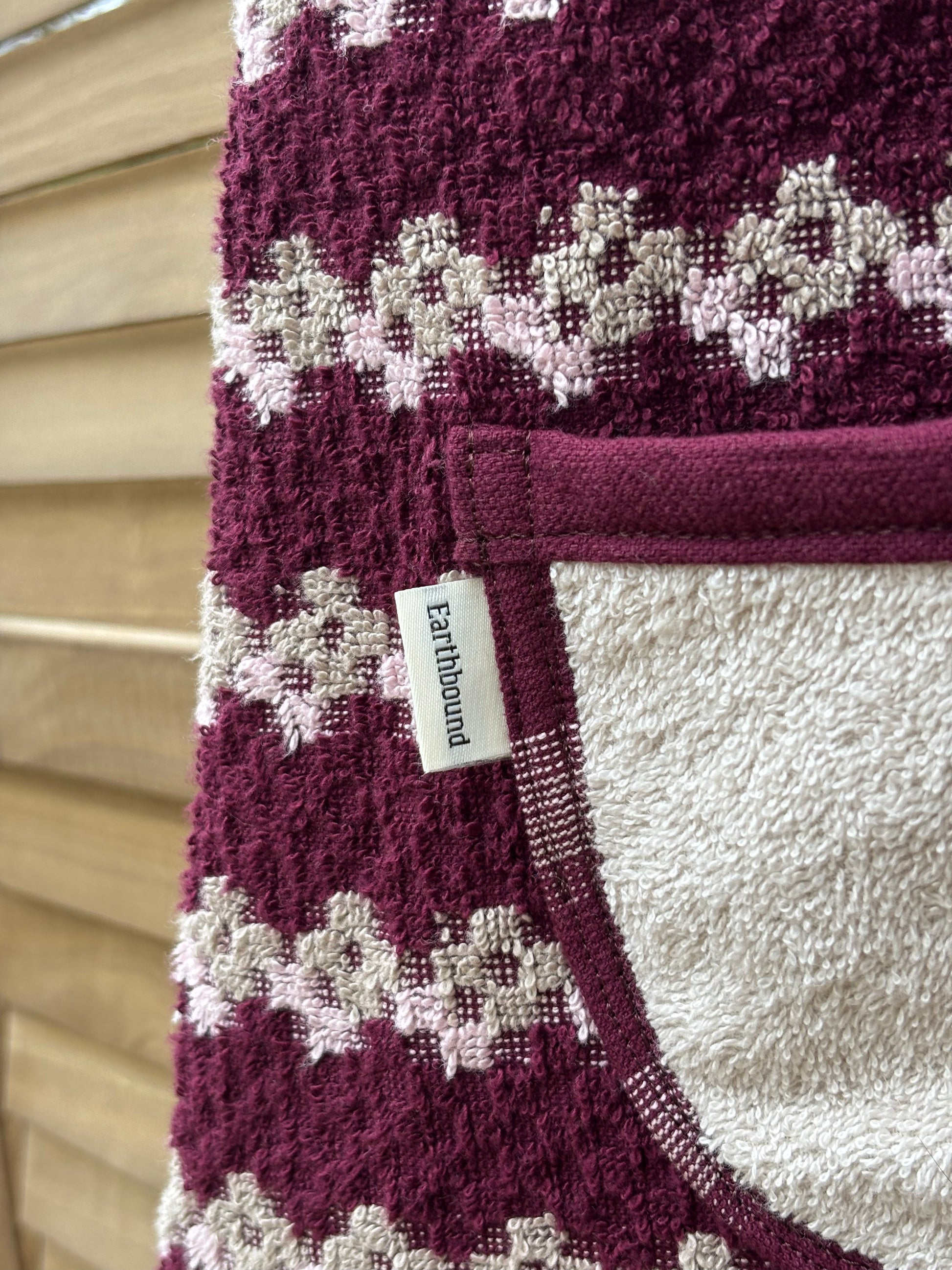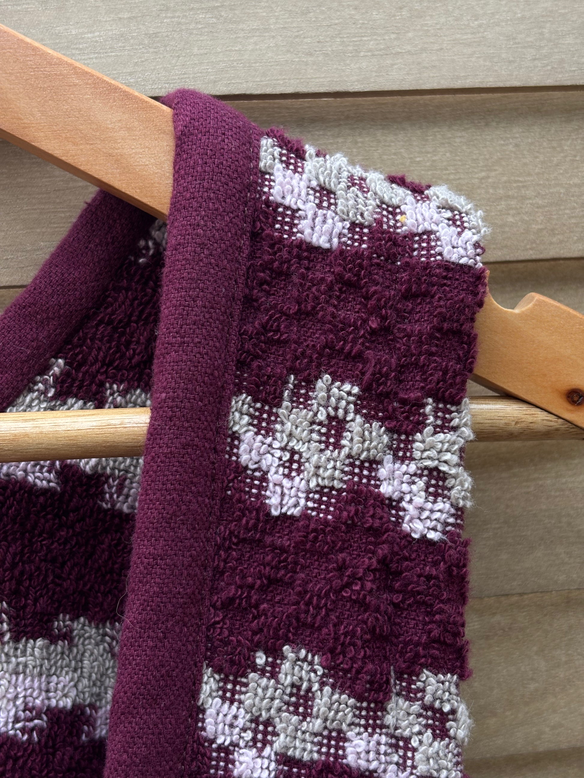This 60’s inspired towel dress is a one of a kind piece with front pockets. The burgundy and sand colours, with little sand and pink flowers, add that vintage touch that makes it feel really special.